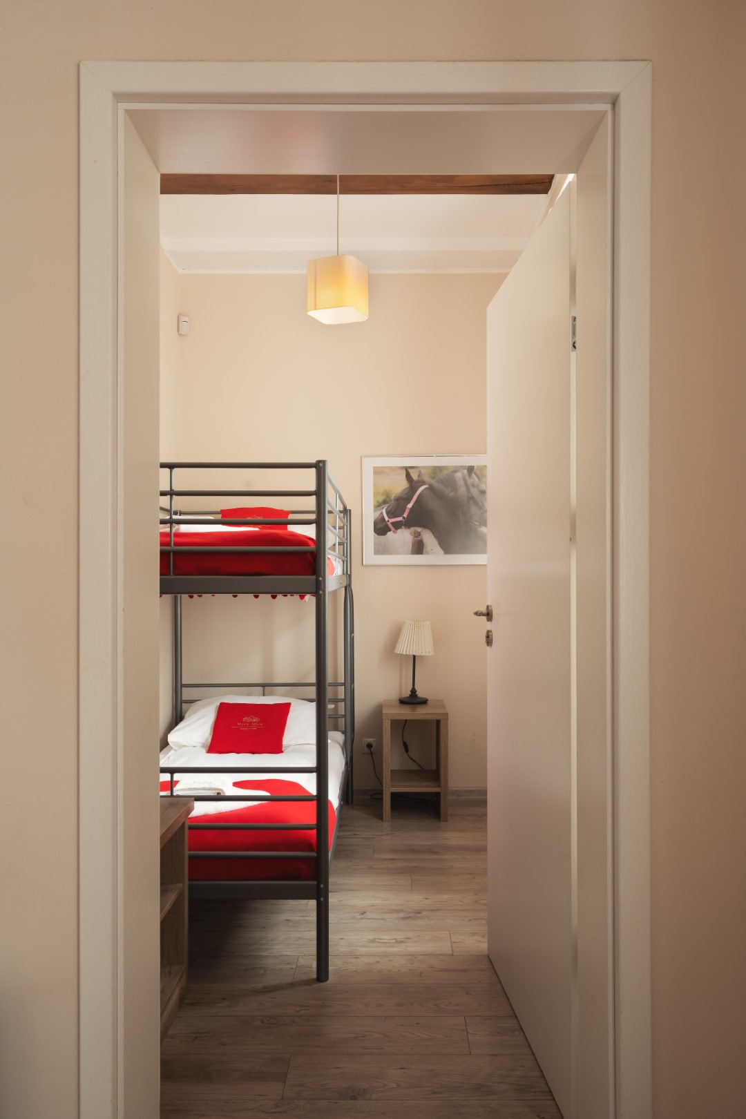 Na parterze Dworku znajduje się przestronny pokój rodzinny, idealny dla rodzin z dziećmi. Pokój składa się z dwóch sypialni: w głównej znajduje się łóżko w systemie hotelowym z możliwością rozdzielenia na dwa pojedyncze, natomiast w drugiej – wygodne łóżko piętrowe. Na życzenie w sypialni głównej można przygotować dostawkę w formie rozkładanego łóżka z pełnowymiarowym materacem.